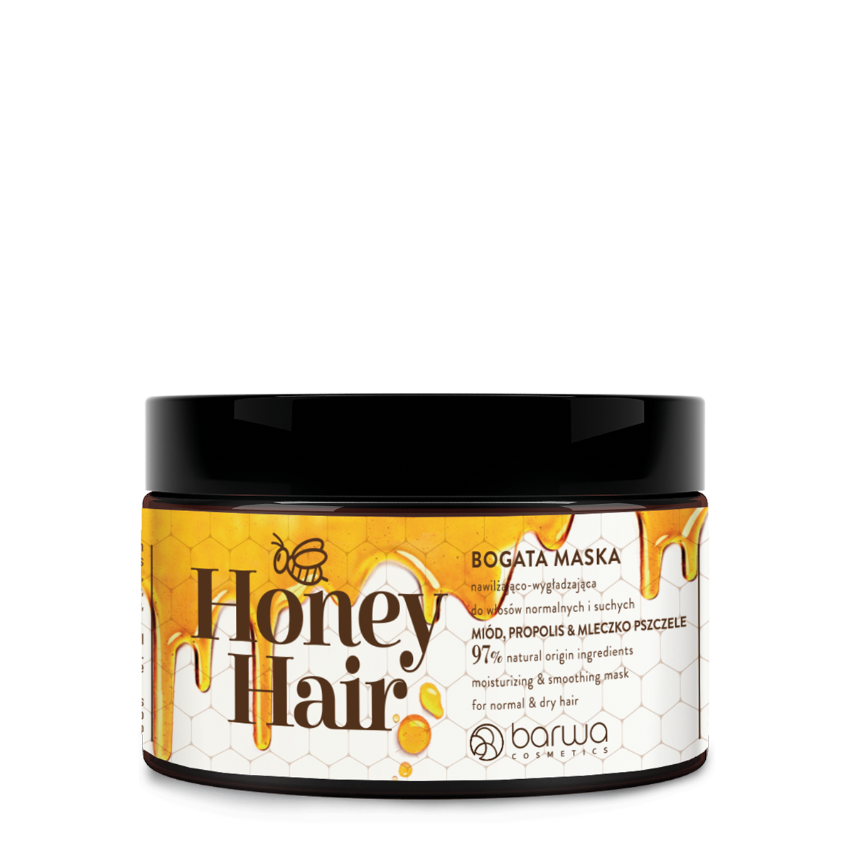 HONEY HAIR opiera się na drogocennych skarbach natury – miodzie, mleczku pszczelim i propolisie. Została wzbogacona olejem lnianym, masłem shea, proteinami ryżu oraz prebiotykiem, tak, by zaspokoić potrzeby zniszczonych włosów. To lekka maska, która będzie odpowiednia dla cienkich włosów nisko- i średnioporowatych, szczególnie zniszczonych po zabiegach chemicznych, czy rozjaśnionych słońcem.