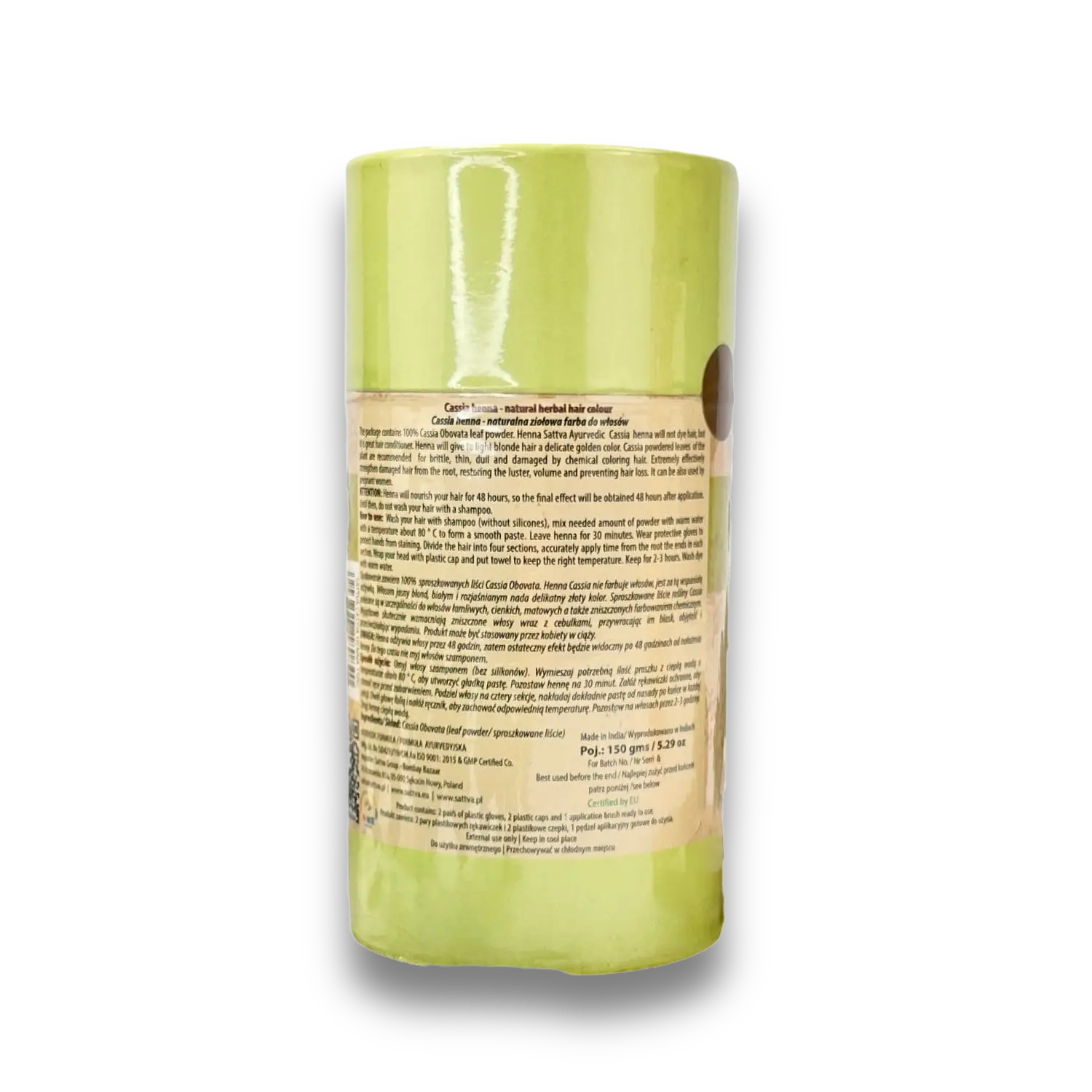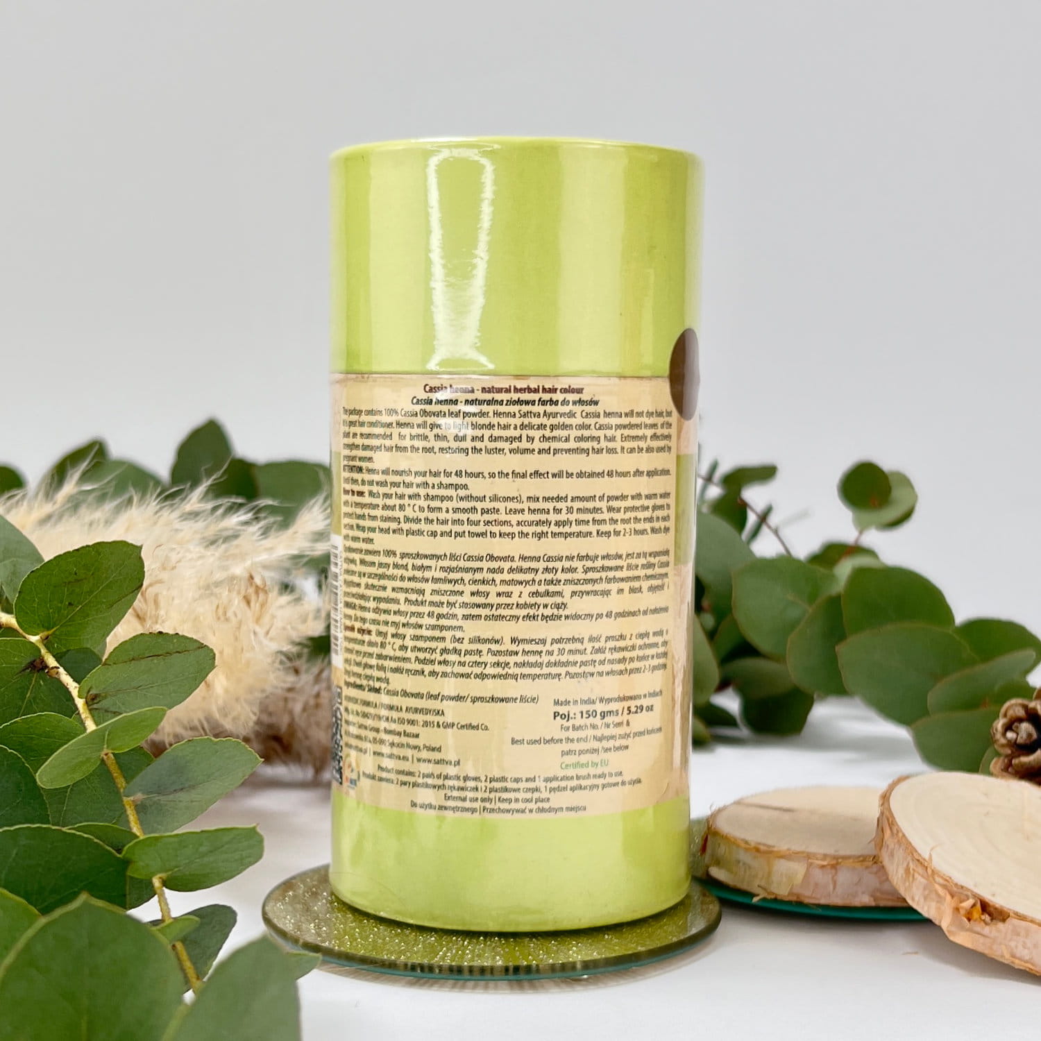 Opakowanie zawiera 100% sproszkowanych liści Cassia Obovata. Włosom jasny blond, białym i rozjaśnianym nada delikatny złoty kolor. Sproszkowane liście rośliny Cassia polecane są w szczególności do włosów łamliwych, cienkich, matowych a także zniszczonych farbowaniem chemicznym. Wyjątkowo skutecznie wzmacniają zniszczone włosy wraz z cebulkami, przywracając im blask, objętość i przeciwdziałając wypadaniu. Produkt może być stosowany przez kobiety w ciąży.