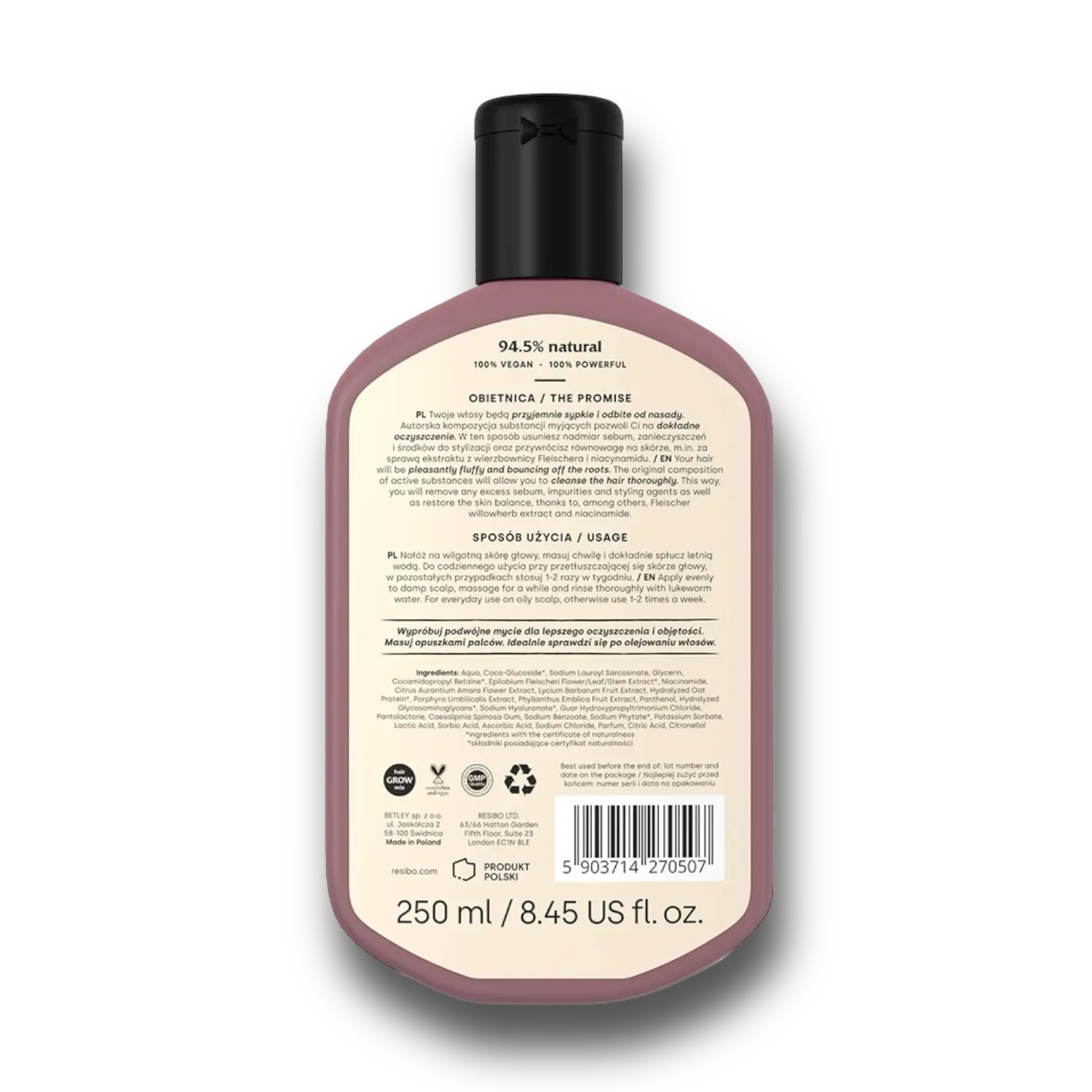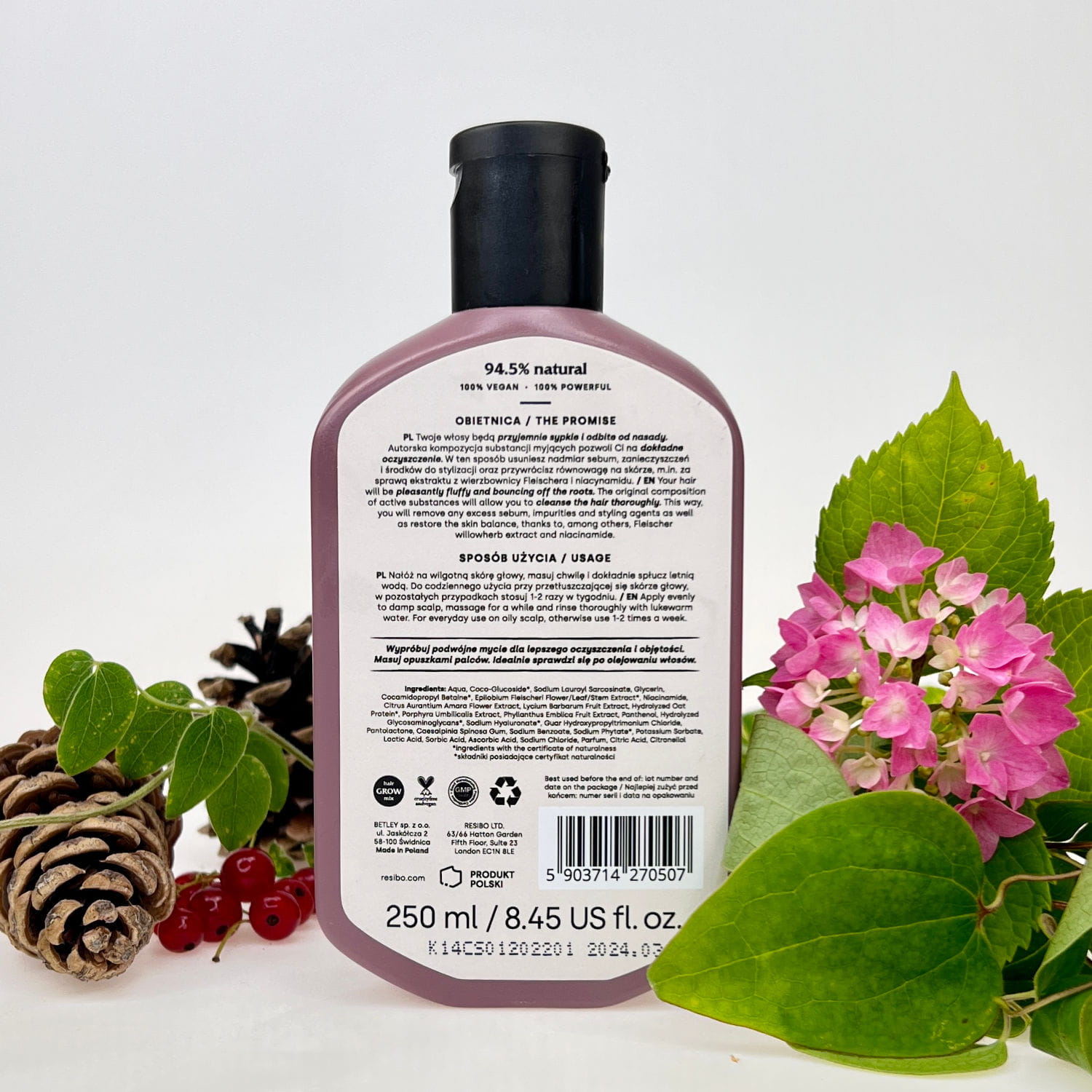 To zasługa bogatych ekstraktów roślinnych. Po pierwsze, ekstrakt z wierzbownicy Fleischera spowalnia aktywność 5-alfa-reduktazy, kluczowego enzymu odpowiedzialnego za produkcję sebum. Po drugie, ekstrakt z owoców amli normalizuje pracę gruczołów łojowych i sprzyja dokładnemu oczyszczeniu włosów i skóry głowy. Po trzecie, niacynamid (witamina B3) przeciwdziała przetłuszczaniu się skóry i ogranicza wydzielanie sebum.